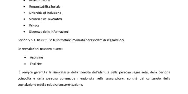 Per garantire ai lavoratori e a tutte le parti interessate (stakeholder) una facile comunicazione di rilievi e suggerimenti, Sertori S.p.A. ha istituito una serie modalità per l’inoltro di segnalazioni. È sempre garantita la riservatezza della identità dell’identità della persona segnalante, della persona coinvolta e della persona comunque menzionata nella segnalazione, nonché del contenuto della segnalazione e della relativa documentazione.